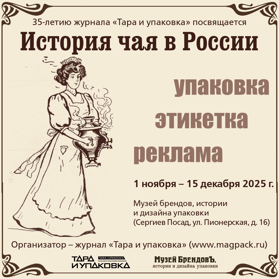 Журнал «Тара упаковка» впервые представляет в Музее брендов, истории и дизайна упаковки ретроспективную выставку «История чая в России: упаковка, этикетка, реклама». На планшетах и на стендах Музея представлены образцы упаковок, этикеток и рекламной атрибутики для чая, использовавшиеся в XIX – начале ХХ вв. Выставка работает с 1 ноября – по 15 декабря 2025 г.